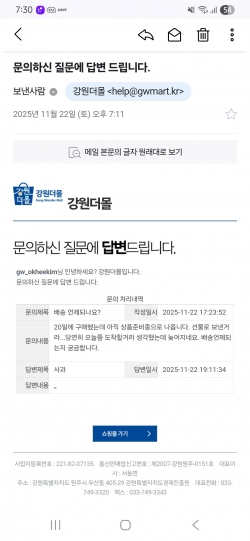 아니 배송 언제되느냐는 문의에 ,,로 답변하는 이유는 뭔가요. 20일구매했고 아직 상품준비중이라 언제 배송될 건지 문의한건데, 무슨이유로 저런 답변을???? 실수로 기존문의를 삭제해 첨부파일로 붙이니, 확인하시고 제대로 답변바랍니다.