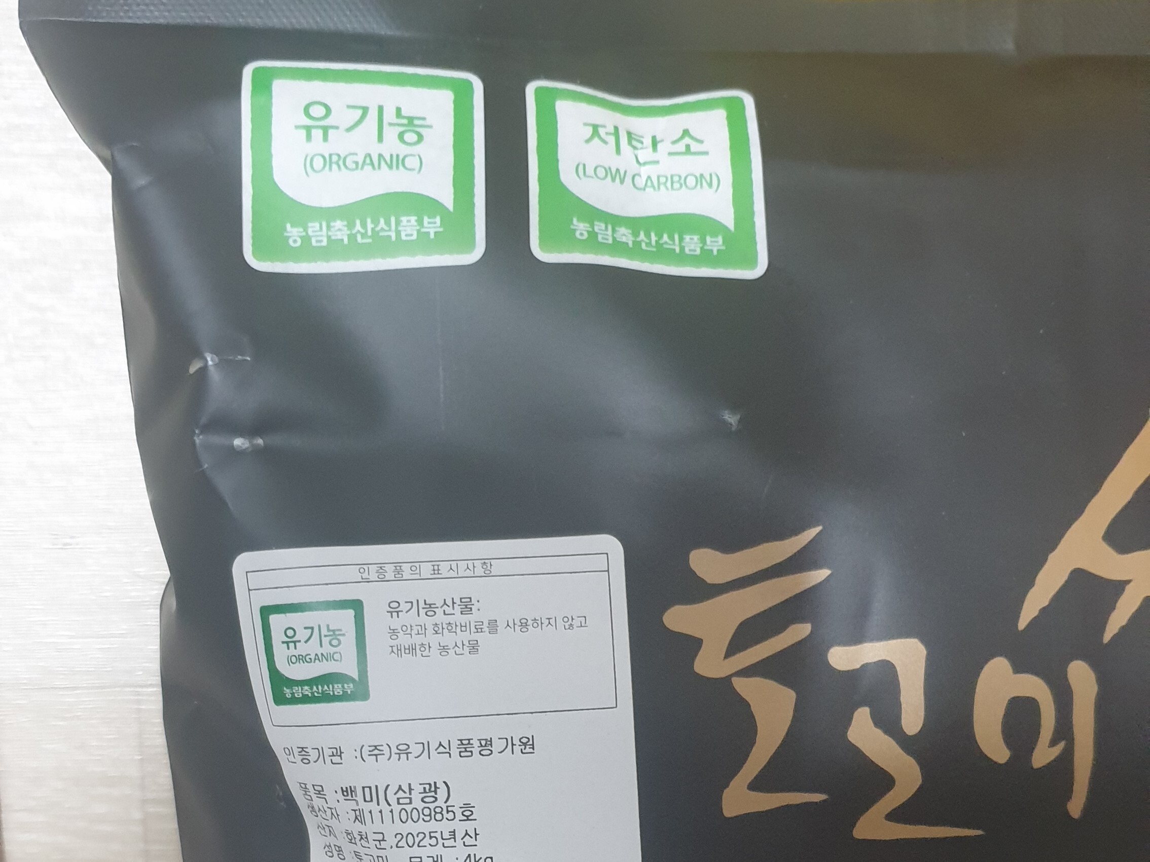 우렁이농법으로 재배한 쌀이라 그런지 밥맛이 고소하고 찰기도 좋네요. 유기농과 저탄소 인증마크도 있어서 믿고 먹을 수 있어요.