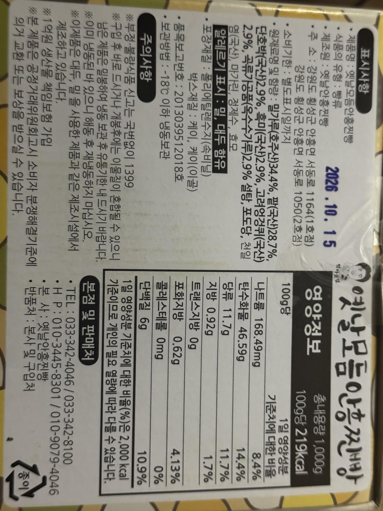 급냉 제품인데 냉매제 하나 안들어있고 밀봉도 안된 비닐채 박스에 덜렁,, 냉동된 제품이라 재냉동 하지말라고 되어 있는데 어쩌란건지 상했을까봐 찝찝해서 못먹어요 안상한다면 방부재를 얼마나 넣은건지 그것도 찝찝하네요 식품은 식품답게 포장 배송해서 팔길바랍니다. 마가린이 들어있는것도 놀랍네요;