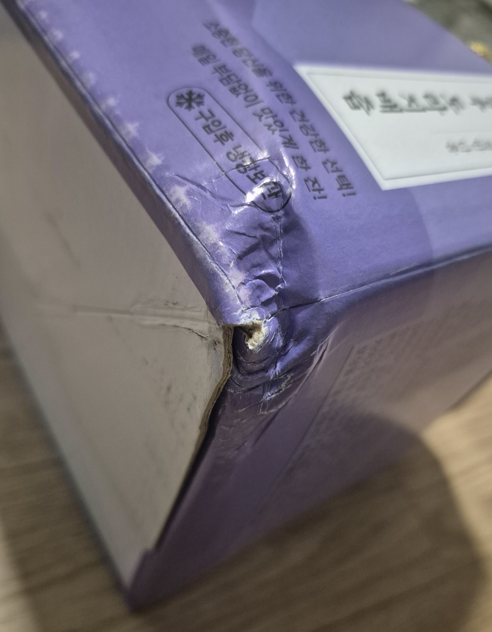 택배상자 보고 헉~ 했는데, 뜯어보니 역시나 상자 모서리가 찌그러져 왔어요. 특히 아래쪽에 있는 상자가 삼각합니다.