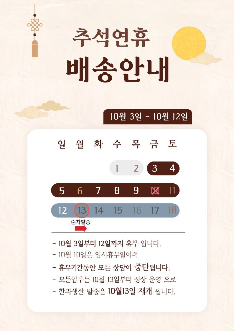 배송기간 : 10월 13일 부터 순차적으로 발송됩니다.