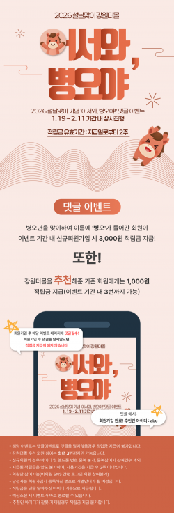 ※ 적립금은 이벤트 기간 종료 후 일괄적으로 지급 될 예정이며, 지급 후 개별 안내 예정이오니 많은 관심과 참여 부탁드립니다! ※ 꼭 성함에 '병오' 가 들어가셔야 참여완료되오니 이벤트 상세페이지 내용 꼭 확인 부탁드립니다! ※해당 이벤트는 1월 19일부터 2월 11일까지 참여가능하십니다. 기간 외 댓글참여는 해당되지않습니다.